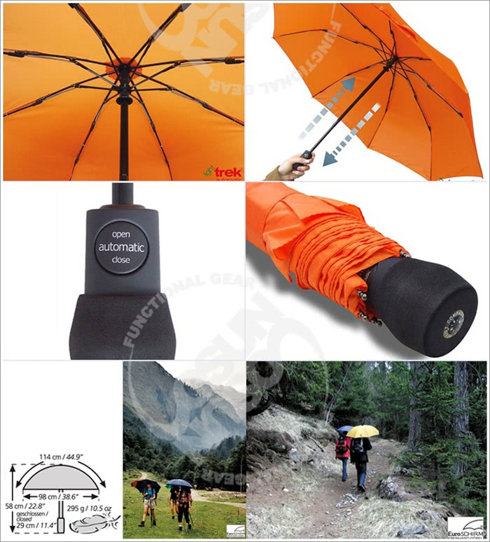 第一支有自動開關骨架的專業健行背包型雨傘結構與材質:傘柱:鋁合金 傘骨:玻璃纖維+最少量金屬優點:自動開關、強韌、質感佳、抗鏽、抗腐蝕。布料塗上堅固的鐵氟龍。傘布二次車縫。(銀色有UPF50+)操作說明:STEP1.按下“自動開關鈕”,傘面即自動打開。STEP2. 收傘時,按下“自動開關鈕”,傘面就會自動“收攏”。STEP3. 再用雙手將“三節傘柱”縮短成一節,即完成收傘動作。備註:1.此款為三節傘,易攜帶。請避免意外折損,維修不易。2.本傘有極少部分必須使用到經過電鍍的鐵的部份,因此也有可能會有鏽蝕發生。建議消費者在使用過後擦拭、並保持乾燥,將可延緩它產生鏽蝕的時間。