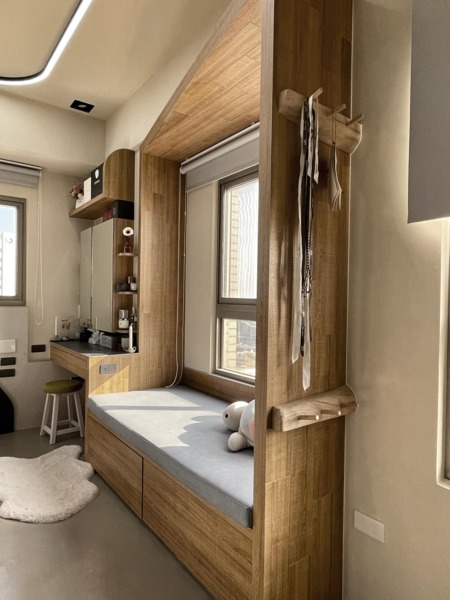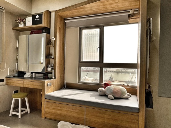 當你很希望有多點空間的收納,卻又不喜歡厚重的櫃體壓縮家的空間,如果你(妳)喜歡給自己一個可以發呆和小睡片刻的空間,在一個窗邊做個臥鋪是個很棒的決定⋯⋯臥鋪高度約45-50cm,深度約90-100,下面可做兩個又大又深的抽屜,超好放的,臥舖頂部以斜面收尾連接梳妝檯,才不會看起來方方正正的,不然遠看會很像相框⋯⋯另外臥舖邊可以配置插座孔,這樣就可以在這裏舒服的使用3C嘍⋯⋯