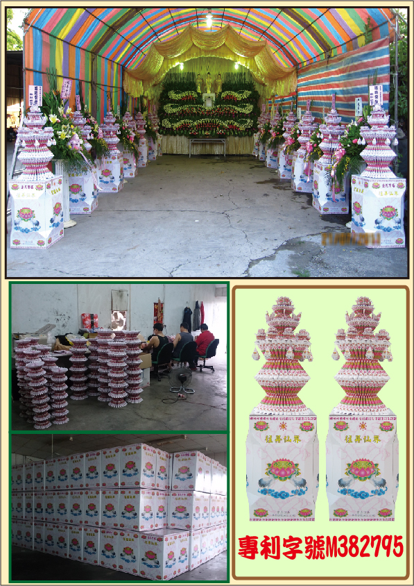 鑑於目前喪家治喪期間,親朋好友為表對往生者敬輓之意,常送罐頭塔.花圈.羅馬柱.蘭花等禮品已為時下常態,由於天氣多變,在加上品質不穩,鮮花凋謝等事後難處理問題,因而本公司特開發【蓮花寶塔】專利奠儀禮品。