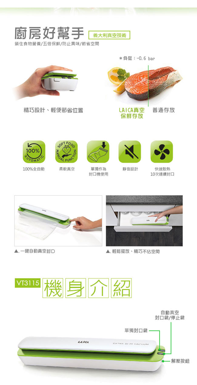 義大利【萊卡 LAICA】適用各大品牌真空袋 極輕巧真空包裝機 VT3115 討論,推薦,開箱,CP值,熱賣,團購,便宜,優惠,介紹,排行,精選,特價,周年慶,體驗,限時