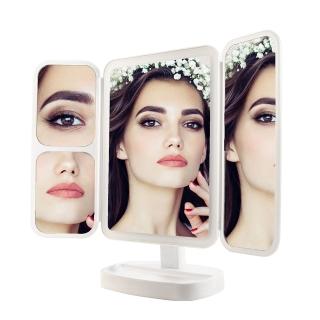 三面化妝鏡可放大倍倍三面化妝鏡,超亮燈條白光燈,高清加大平面鏡與放大鏡。一鍵感應觸控,長按可調節燈亮度大小。立體式三面鏡,摺疊設計方便收納,展開後加大鏡面,還可以依需求調整鏡檯角度。超穩固坐檯,使用安心還有可以放置小物的物品槽,貼心實用抽屜式三層收納盒多層式收納設計加大容量節省空間頂部開放式平台分類清楚好辨識下層抽屜式開關收納取物更方便