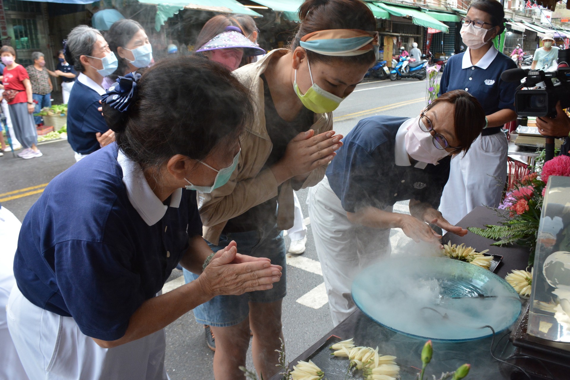天空飄起雨來,志工幫民眾撐傘,民眾在雨中虔誠浴佛,很多民眾回家後又邀約家人及鄰居來浴佛,一位民眾在浴佛臺前緊閉雙眼,虔誠祈願,他沒想到在菜市場也能浴佛,因孫子在醫院的加護病房治療,他想藉由浴佛,祈願佛菩薩保佑他的孫子早日康復。