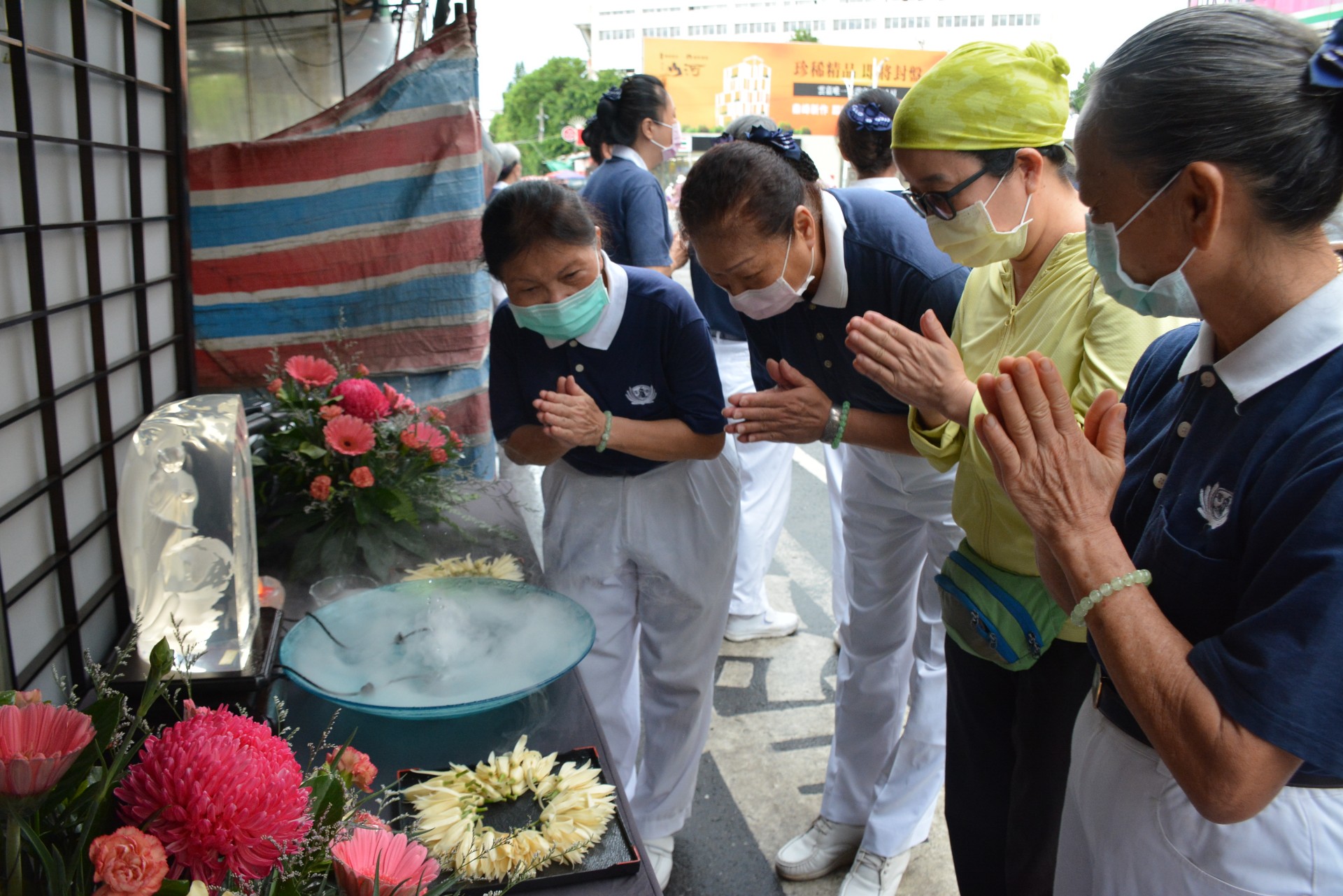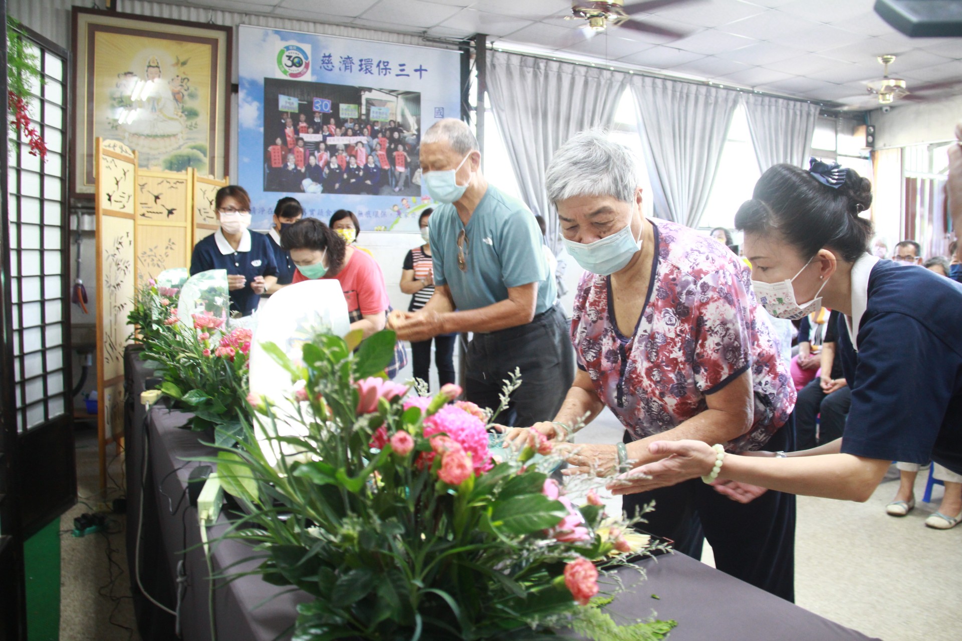 從美國回來八十多歲的鄭登福,扶著行動不便的太太來參與浴佛,平時二人都在環保站做環保,夫妻倆原本臺灣及美國二地往返,但因疫情就沒再回美國,表示做環保對太太的腦力及行動力幫助很大,在浴佛的同時,內心很感動,感恩過世的母親,也感恩環保站為長者帶來身心的依止。