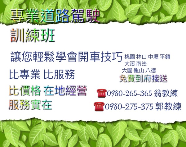 桃園道路駕駛訓練班 翁教練郭教練年輕團隊0980-265-365 到府接送學開車 專教有駕照不敢開車