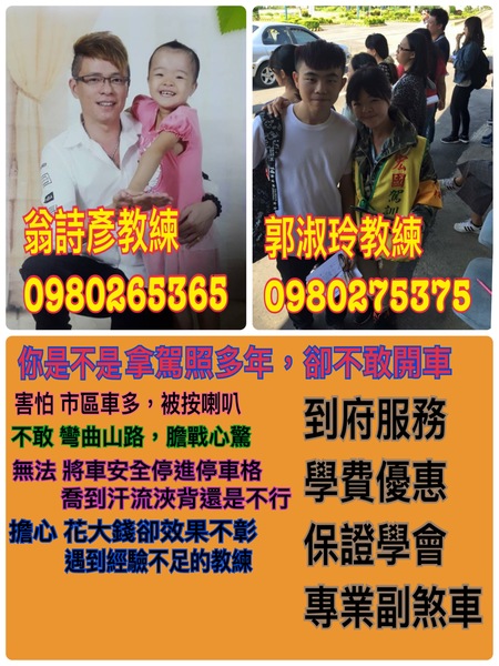 - 有駕照不敢開車 專業道路駕駛教學 新竹 桃園 新北 台北 0980-275-375郭淑玲教練 0980-265-365翁教練
