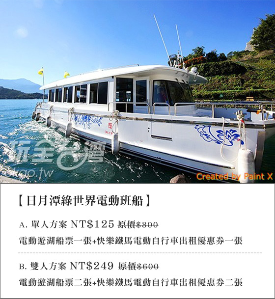 商品訊息簡述: 只要125元起即可享有【日月潭綠世界電動班船】原價最高600元遊湖船票專案:(A)單人方案/(B)雙人方案,專案皆含:電動遊湖船票+快樂鐵馬電動自行車出租優惠券(依專案人數)?