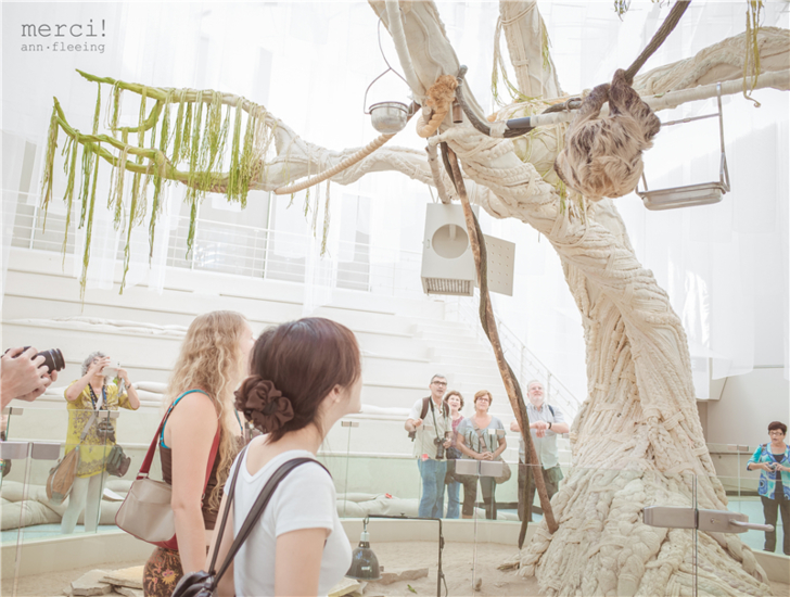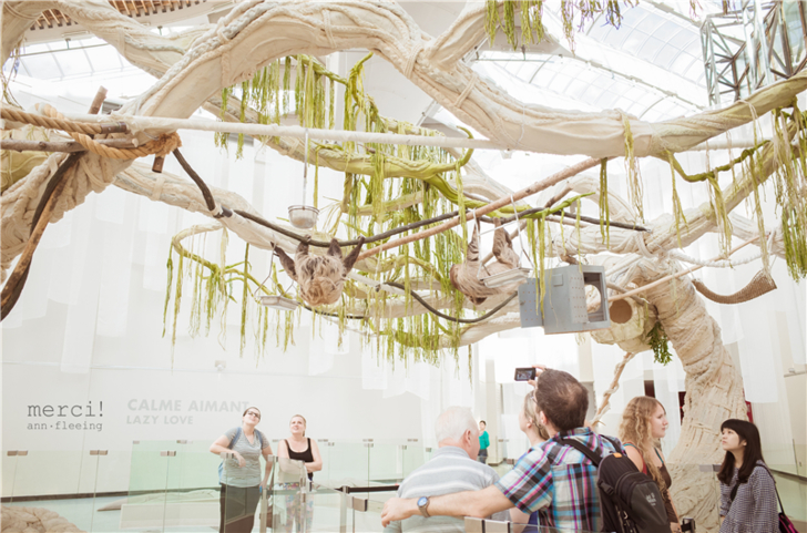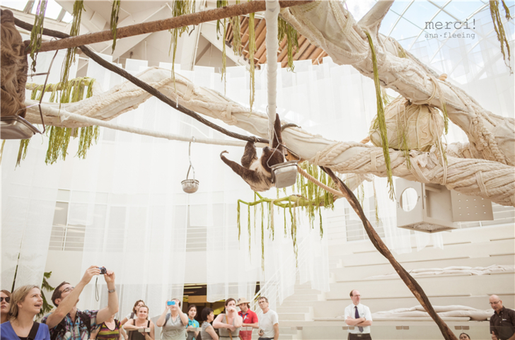 走到出口前又回到入口的大廳區,兩棵大樹,我們定神一看,上面吊著的兩隻不就是我們找尋已久的樹懶嗎!!!進來時匆匆走過居然沒發現~這裡有官方影片體驗體驗現場氣氛。
