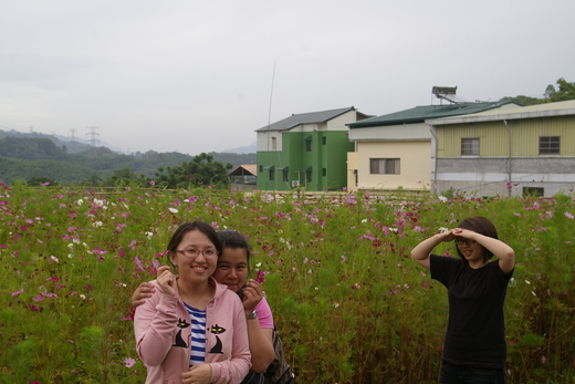 經過了最近小有名氣的薑麻園,我們並沒有停下腳步,因為老天爺還在鬧脾氣,正哭著呢!當我們快到大湖的時候,發現了一片花田-波斯菊花田。