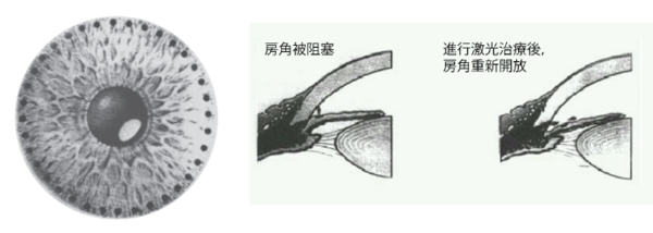 急性青光眼的治療需要儘快降低眼壓至安全水平,以減少視神經損傷及出現眼部其他組織併發症的機會。傳統的治療方法包括同時聯合使用抗青光眼眼藥水和口服藥物以降低眼壓。然而,傳統的治療方法療效對眼壓的控制並未盡人意,因為使用藥物降眼壓至安全水平可能需要數小時,甚至數天,而眼壓維持在高水平的時間越長,對眼睛組織的影響就越大,同時病人也會更長時間地被不適症狀所影響。另外,降眼壓的藥物也可能出現一些全身的副作用,例如對心跳和血壓的影響,對腎臟的影響,手指腳趾的麻痹,食慾減低等等。因此傳統的治療方法在急性青光眼的即時治療中,並不十分滿意。有見及此,林醫生在全球首先在急性青光眼的即時治療中引入激光虹膜邊緣成形手術(Argon Laser Peripheral Iridoplasty,APLI)(圖4)以使得虹膜收縮,房角重新開放,達到迅速降低眼壓的目的。