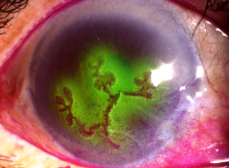 因角膜已受傷,然後又接觸到受污染的土壤或水源(藥水,自來水或泳池水等),常見於隱形眼鏡配戴者和外傷病人。一旦患上,病人會有強烈的疼痛感,角膜會發現典型的環形浸潤,早期治療與發現很重要,和預後有很大的關係,一旦進入到角膜基質層,治療的時間可能要延長。