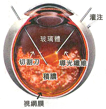 另外,也可以採用眼睛周圍注射抗生素藥物以作輔助。至於靜脈注射抗生素治療眼內炎的療效,目前研究顯示效果不明顯,因為使用靜脈注射抗生素最後到達眼內的藥物很難達到治療濃度。而如果經醫生評估確定情況嚴重,則需要儘早接受手術治療(圖2),清除玻璃體內及前房的病菌。