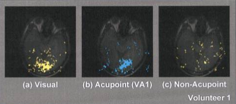 現時針灸在多個西方國家已備受重視,更開展了多項研究。有研究結果顯示,通過功能性核磁共振(MRI)可以證明中國古老的治療眼病的針灸穴位與西方醫學描述的腦視覺中樞有對應性,當針灸刺激位於足外側與視覺相關的穴位時,功能性核磁共振可以觀察到枕葉視中樞有興奮現象(圖3摘錄自ProcNatlAcadSciUSA.1998;95:2670-2673.)。