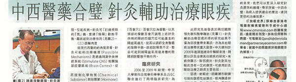 西方醫學與傳統中醫看似南轅北轍,但經研究人員多番努力,陸續證實以中西醫學結合醫治某些疾病,可發揮更佳治療效果。對於一些目前難以用常規療法治癒的眼疾,針灸或許能為患者提供另一種治療的途徑。展望在不久的未來,我們可以更深入研究針灸療效的機理,尋求突破,中西合璧,為病人提供適合的療法,達至更佳的治療效果。