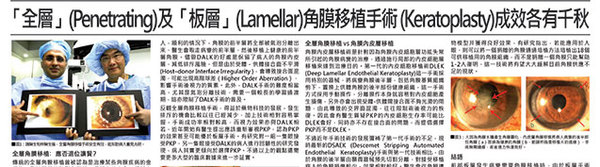 前部板層發生病變需要角膜移植時,由于板層手術 (DALK) 難度高且存在接合面問題,全層角膜移植手術(PKP) 或會是更佳選擇。新的內皮層移植技術 (DSAEK),在內皮細胞生存率和接合面方面都得到改善,估計在將來應該會更廣泛地被使用。而全層角膜移植手術 (PKP) 因能獲得和板層手術相若的手術視力效果,目前仍具是角膜移植手術的重要選擇。現時醫學發展一日千里,期望在不久的將來有更新更好的角膜移植手術面世。