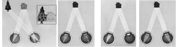 2. 斜視性弱視 (Strabismus Amblyopia):兩個眼球肌肉不能協調運作,造成兩眼視線不平行,或看東西時,兩眼的視線無法同時落在要看的目標上。初始,看東西時會產生複視及視覺混淆,大腦會自發地抑制斜視眼的視覺發育,以減輕視覺干擾。斜視眼的視覺發育被抑制,即導致弱視。