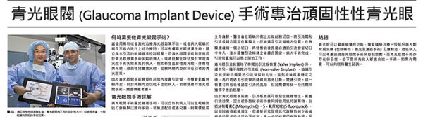 青光眼是主要致盲眼病之一,可以對視功能造成不可逆轉的損害,臨床上有部分青光眼病人對常規的青光眼治療方法反應較差,這類青光眼稱為「頑固性青光眼」 (Refractory Glaucoma) 。而青光眼閥 (Glaucoma Implant) 植入手術 (圖1) 的發展使得「頑固性青光眼」的療效明顯提高。