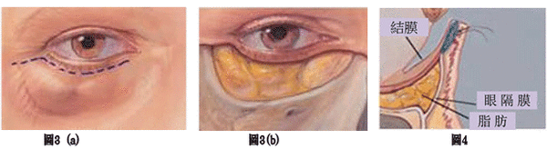 到目前爲止,去除眼袋最有效持久的方法是進行手術。而最常見的手術方法是瞼緣切開法 (圖3 )。這種手術的具體操作是: