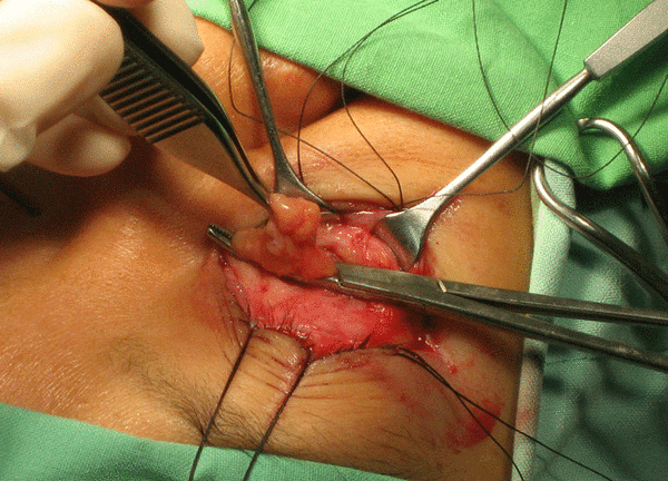 (2)脂肪切除術(圖4-a,b):眼球突出程度較輕者,可經球結膜切口,切除眶內脂肪,尤其是肌錐內脂肪,達到緩解癥狀的目的。但要注意避免眶內出血等併發症,可與眼眶減壓術聯合使用。