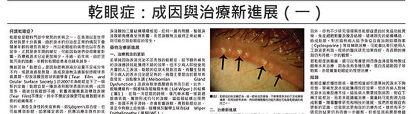 若單純因為淚液分泌不足而致的乾眼症,給予額外補充的淚液應該就能獲得不錯的效果。但不少病人即使使用大量的人工淚液,乾眼的症狀未見到改善。有醫生發現不少病人的淚水分泌是足夠的,病徵主要是由於眼球表面發炎、油脂腺失調(Meibomian Gland Dysfunction)及淚液膜滲透壓過高等而引起。此外,眼瞼邊緣有一個被稱為眼瞼撥水板(Lid Wiper)的結構(圖1),在每一次眨眼的時候,像汽車水撥一樣刷過眼睛表面,幫助形成均勻的淚膜,當這個結構出現問題,表面不再平滑時,亦會影響淚膜,導致乾眼症狀,甚至令角膜上皮受損,這種情況醫學上稱為Lid Wiper Epitheliopathy(簡稱LWE)。