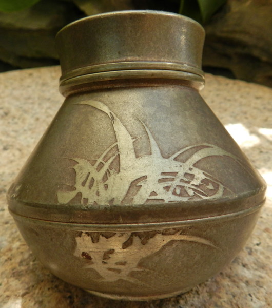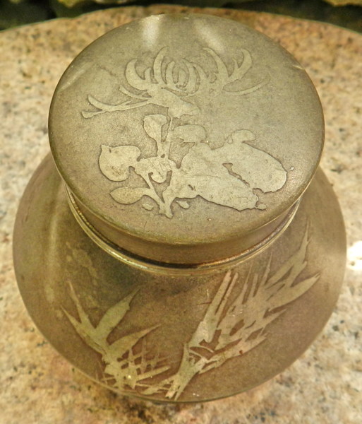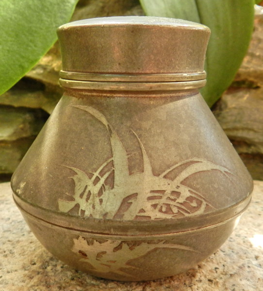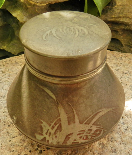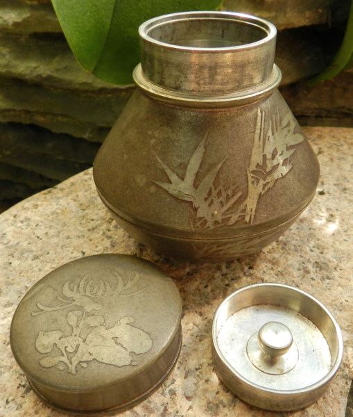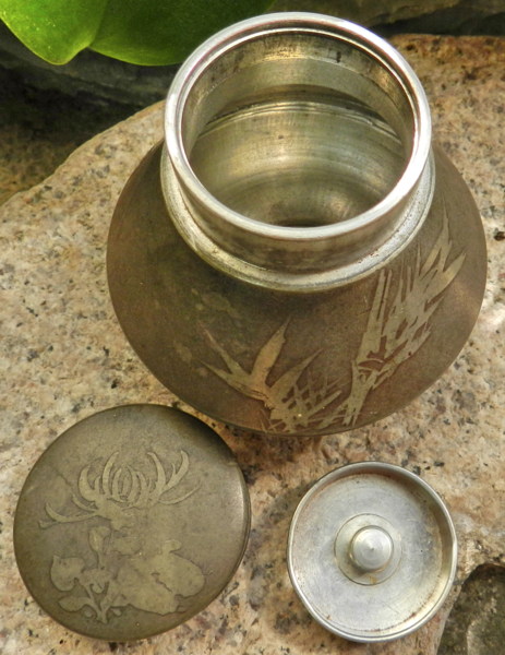 昔物齋(日本鐵壺)~(瓶底~未識款)(蘭菊竹文樣車軸形茶倉~高8cm~寬9cm)分享