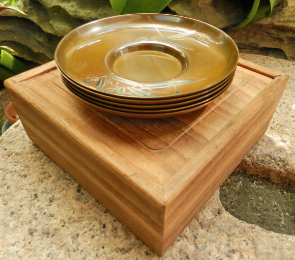 昔物齋(日本鐵壺)~(無款)(經典銀鑲嵌黃唐銅梅.牡.竹.菊.松五只杯托)分享