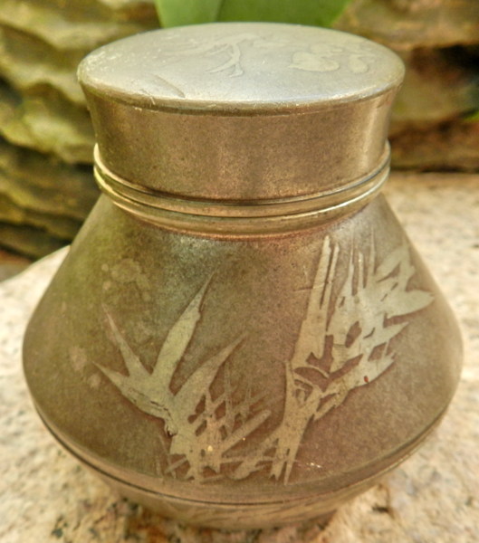 昔物齋(日本鐵壺)~(瓶底~未識款)(蘭菊竹文樣車軸形茶倉~高8cm~寬9cm)分享