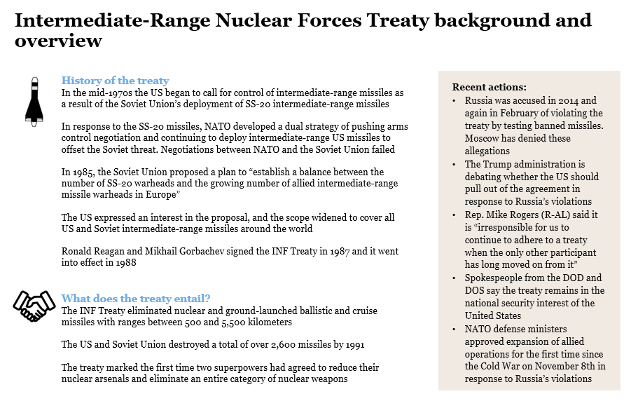 美國總統特朗普(Donald Trump)宣布退出冷戰時期的《中程核導彈條約(Intermediate-Range Nuclear Forces,INF)》 ,指摘締約國俄羅斯多年前已違約,質疑前總統奧巴馬(Barack Obama)不作為。俄羅斯重申條約對國社安全和核安全有重大意義,批評美方舉動十分危險,並企圖藉勒索手段迫使俄方讓步。