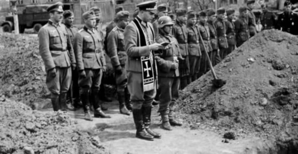 納粹黨德軍牧師,為死亡者做最後的祈福禱告,願他們安息,在異域為國捐軀,願他們的靈魂身升天,永別喇,英勇的戰士們.