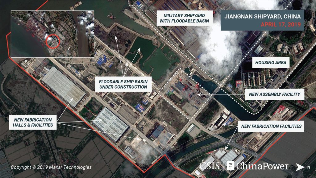 The construction of a third aircraft carrier – the Type 002 – appears to be underway at China’s Jiangnan Shipyard. Commercial satellite imagery collected on April 17, 2019 shows significant new activity since ChinaPower first analyzed the shipyard in late 2018. At the new assembly facility to the southeast of the existing shipyard, there is evidence of a large vessel being assembled and a floodable basin being constructed.