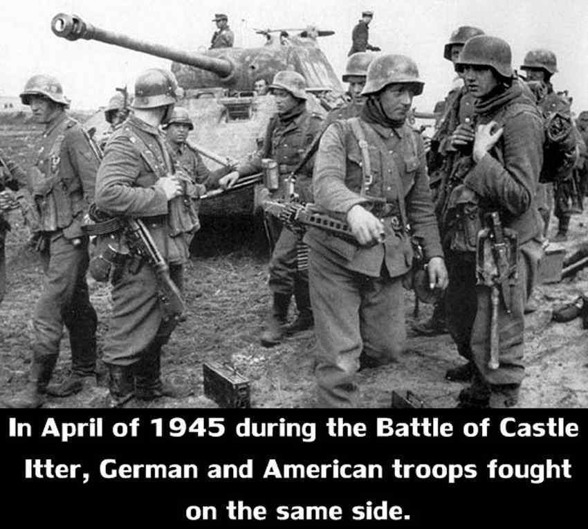 德國《明鏡》週刊曾發表了名為《當德國國防軍和美國人並肩對党衛軍作戰》的文章,文中介紹了二戰中最有戲劇性的一戰-伊特堡之戰,部分德軍與美軍聯合,對抗党衛軍。圖為戰後,美軍士兵與反黨衛軍的德國國防軍士兵握手合影。