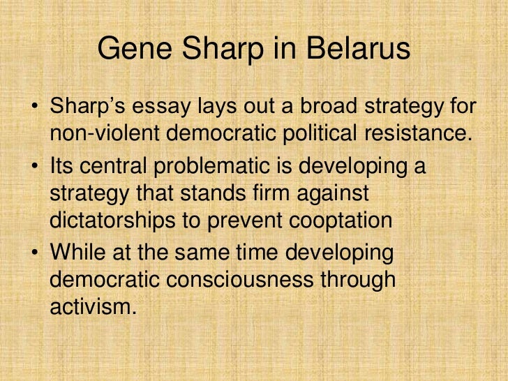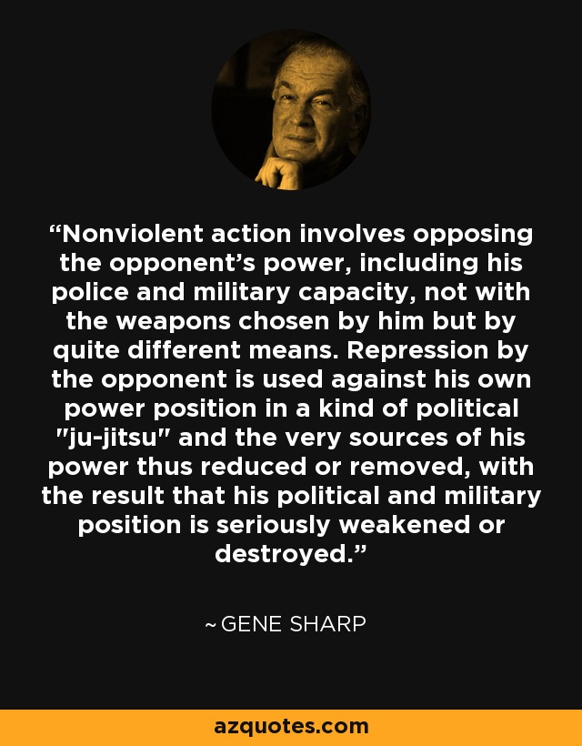 2、非暴力戰爭的戰鬥方法:夏普在1993年出版《從獨裁到民主》一書中對他過去的著作進行了總結,歸納出了3大類、40小類別的總共198個的非暴力戰鬥方法。三大類別包括:非暴力抗議和勸說的方法、不合作的方法、非暴力干預的方法。