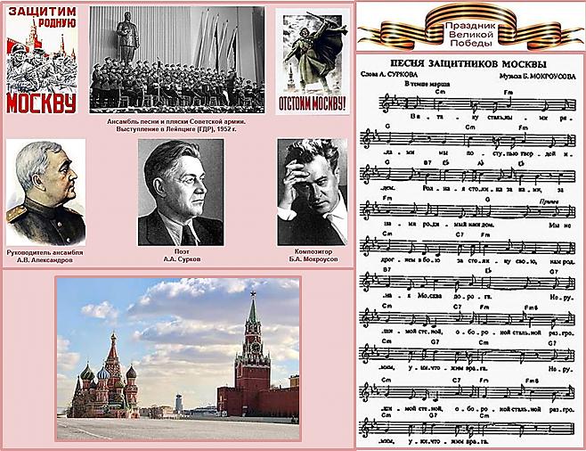 第二次世界大戰蘇德戰爭時,納粹德國入侵蘇聯,開始了激烈的莫斯科戰役;當時,阿列克謝·蘇爾科夫是一名《紅軍真理報》記者,他創作了《莫斯科保衛者之歌》的歌詞,並於1941年11月3日發表在《紅軍真理報》上。同月11日,《莫斯科晚報》也刊登了蘇爾科夫創作的歌詞,引起中央紀錄片製片廠製作人員的注意。