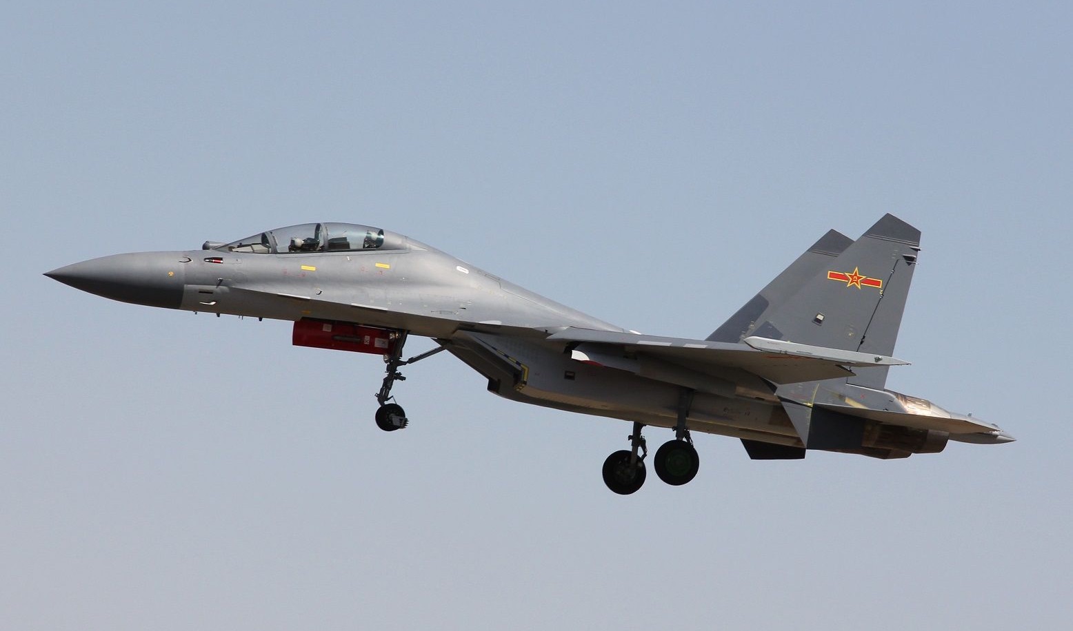 In contrast to the J-11BS it features twin-wheel nose gear, refueling probe and the taller vertical fins of the Su-30MKK (albeit with the standard ‘clipped’ fin tips).