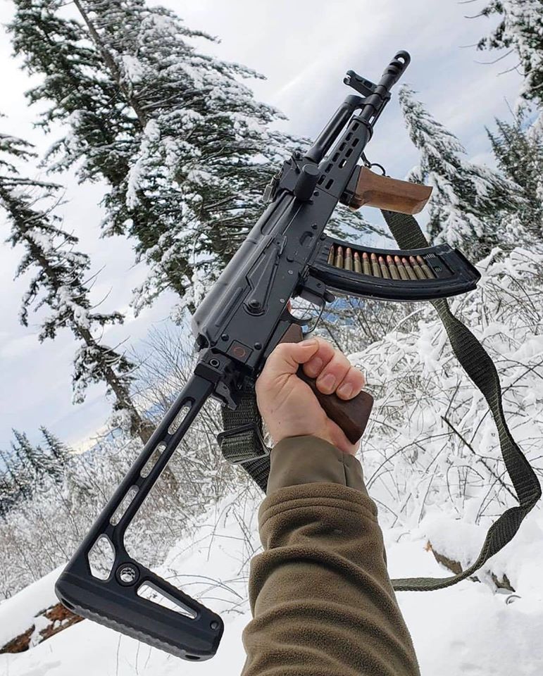 AKMS是裝有金屬摺疊槍托的AKM改進型,槍托摺疊後長645毫米,重量減至3.15公斤,主要裝備當時的傘兵部隊、坦克兵和特種部隊使用。AK-74的摺疊式槍托型,主要供傘兵部隊裝備。
