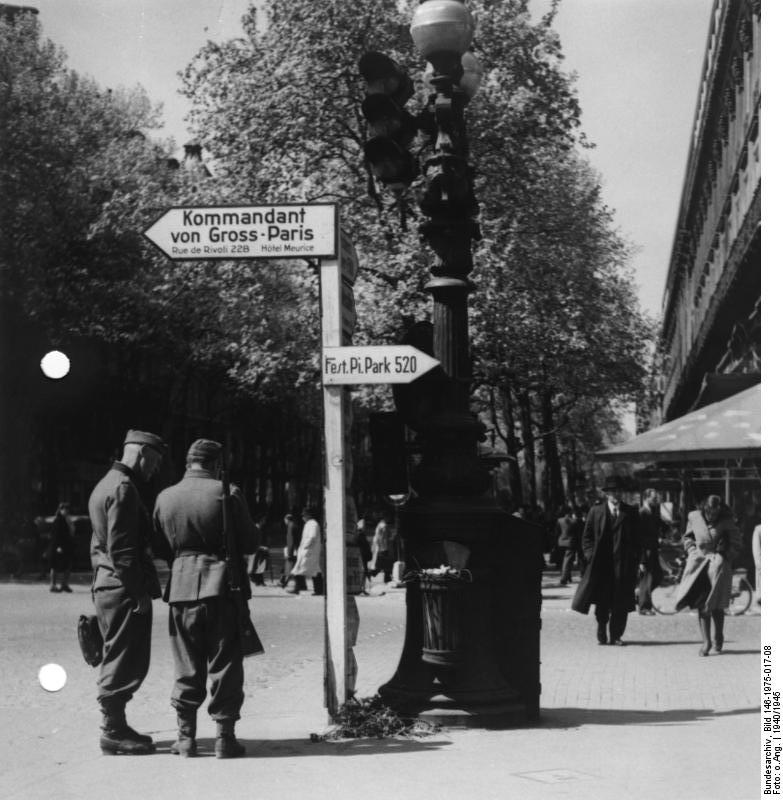 19400623.希特勒巡視巴黎及艾飛爾鐵塔,傳聞他在進攻巴黎之前,下達命令不得攻擊燬壞巴黎的名勝古蹟,諸如凱旋門,艾飛爾鐵塔,羅浮宮及法國拿破崙的皇宮,聖母院大教堂,博物館,美術館,歌劇院等歷史建築物,甚至於紅磨坊舞場必須照常營業,招待德軍以示勞軍,但是希特勒手下趁火打劫,奪取許多名畫及古董變賣求現金花用,194006-194506.這些年來凡是駐紮巴黎的德軍部隊,都發了橫財,夜間的巴黎充滿鶯鶯燕燕,在各大酒吧,咖啡店,舞廳,妓院,招待德軍上門照顧生意,使得花都巴黎在第二次世界大戰期間,依舊歌舞昇平,夜夜笙歌,好不熱鬧的五光十色的夜生活,.社會學者分析認為,這樣一來歷史的記載與以往的歷代歷朝征服巴黎沒有兩樣,當時許多法國女人,相繼移民到巴黎討生活,服務德軍,否則一家老小會餓死,不是被德軍的炸彈炸死,巴黎的確是人間天堂,但是對於法裔的猶太人就是地獄,他們多數人被德軍逮捕送到集中營罰勞役最後處決,在第二次世界大戰期間,各式各樣的物質扔然充分供應,許多巴黎奸商掛勾德軍大做黑市生意大撈戰爭財,醇酒美女依偎在德軍身旁好極了,順便探聽情報,給予美軍及法國遊擊隊,這樣一來照造就戰後許多的電影與電視劇的題材表現,其中又以"戰火浮生錄"電影中的情節表現最為接近事實,第二次世界大戰期間,許多休假的德軍,都選擇到巴黎渡假,因為名額有限,以戰功排名抽籤,也有出售所有權變成現金的.