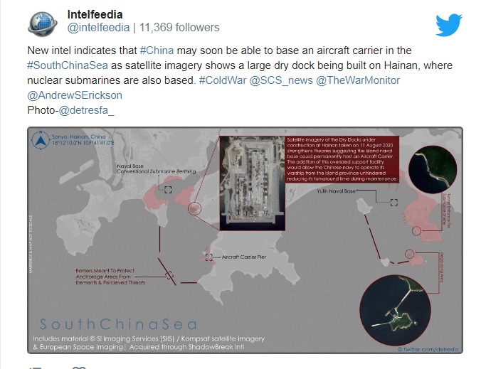 中國已經在海南島榆林海軍基地,建造航空母艦所需的乾船塢,顯示解放軍正在加強海南的戰略基礎,並很快就會在南海設立永久航母基地。乾船塢對於讓戰艦保持戰鬥狀態很重要,而航空母艦因為特殊的規模,需要特殊的設施。