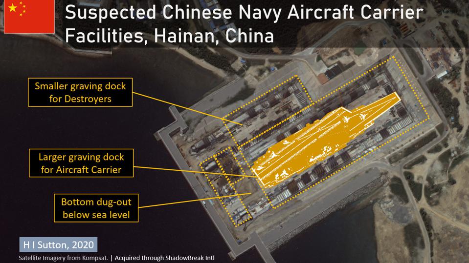 根據d-atis取得韓國與歐洲太空總署新的衛星照片,在海南建造的新船塢幾乎是中國航母的理想尺寸,而且位於內港入口附近,包含1個地下隧道,可以保護潛水艇免受空襲。