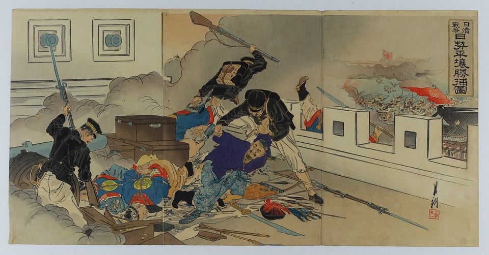 當日下午4時半,城內餘下清軍停止射擊,並舉白旗投降,但隨即以雷雨突至為由,向日方表示翌早才開城。當時9時,雨勢漸歇,清軍乘機逃出,日軍重新發起進攻,至16日凌晨1時10分左右首支部隊終於由暗門進入城內。當時日軍並未帶有充足糧食,清軍撤退遺下的糧餉為日軍解決了果腹的難題。日本趁勝追擊與大清海軍在黃海爆發激烈的海戰(有證據顯示出日本海軍偷襲大清國海軍運輸艦高陞號)日本大勝,殲滅大清帝國所有海軍,日後訂立馬關條約清朝割讓台灣省給予日本.甲午戰爭顯示出日本是有計劃的攻打朝鮮及大清帝國奪取台灣省進行帝國主義的擴張.1894中國海軍全軍覆沒,直到2000年中國海軍再度強勢崛起,中國海軍解除106年的真空狀態,由於1949中華人民共和國建立,成立海軍僅有幾艘小炮艇及租用的漁船充場面而已,後代中國人的子孫,應該記得甲午戰爭血淚的教訓,沒有強勢的海軍,就沒有海防及國際貿易的資格,也沒有海關掌管權與話語權,如今中國海軍全面發展,成為世界第二大的海軍,保衛國家及人民的安全.