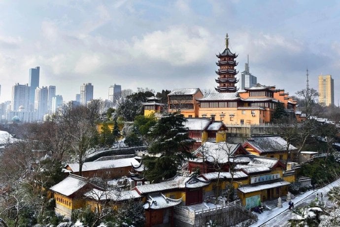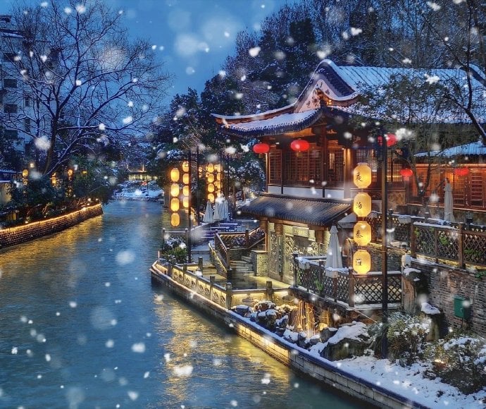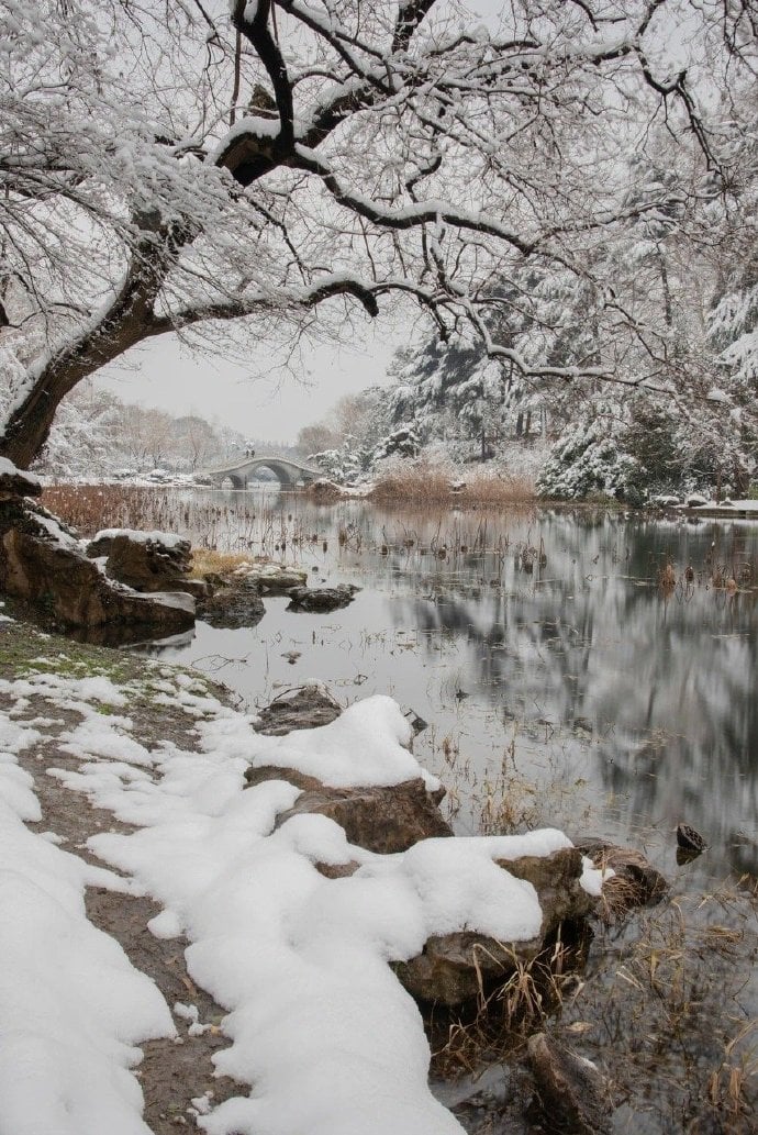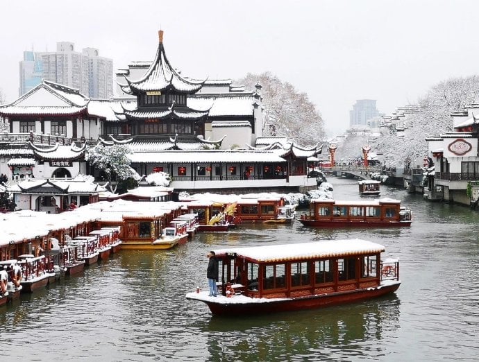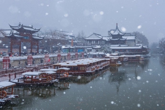 近日來中國長江流域以南,遭受到西伯利亞寒流入侵,大雪紛紛落下, 金陵城外秦淮河畔及四周鄰村,皆以白雪皚皚,美不勝收,百年難得一見,雪中遊覽秦淮河,欣賞冬季美景,別具一格,3杯兩盞淡酒怎能禦寒?