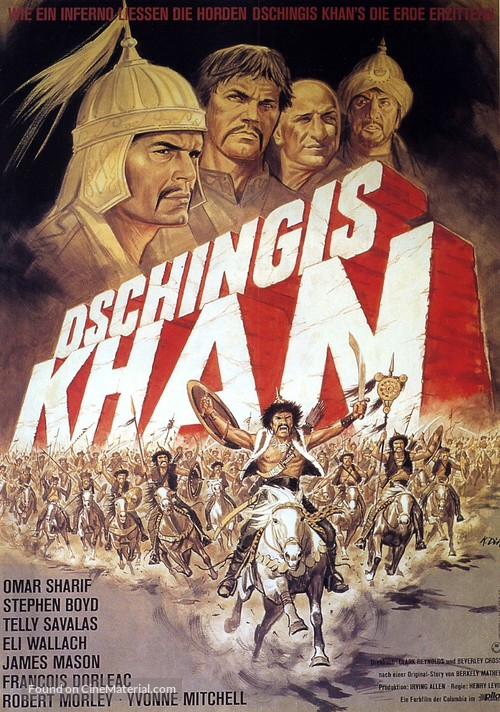 Genghis Khan is a 1965 adventure film directed by Henry Levin and starring Omar Sharif, depicting a fictionalized account of the life and conquests of the Mongol emperor Genghis Khan. Distributed in the United Kingdom and the United States in 1965 by Columbia Pictures, the film also features James Mason, Stephen Boyd, Eli Wallach, Françoise Dorléac and Telly Savalas........................