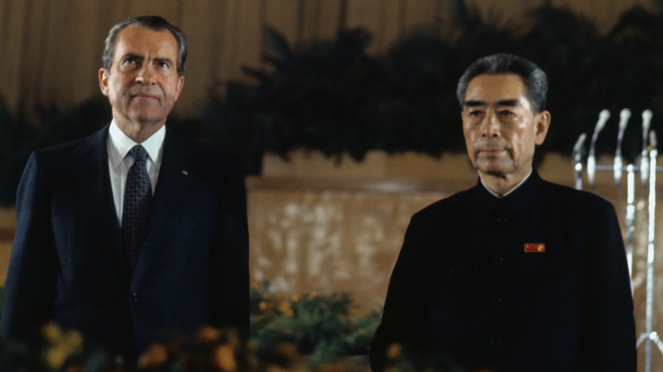 .1972年2月21日,美國時任總統尼克松應中國時任總理周恩來邀請,實現歷史性上首次訪華,期間與領導人毛澤東會面,結束兩國多年彼此孤立和敵對局面,亦為之後兩國建交以及中國加入國際外交舞台奠下基礎。