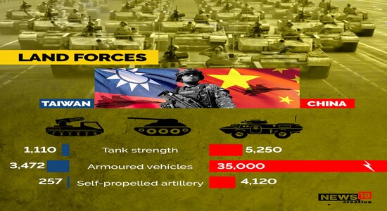 Taiwanese military personnel drive a CM-25 armoured vehicle across the street during the Han Kuang military exercise, which simulates China’s People’s Liberation Army (PLA) invading the island on July 27, 2022 in New Taipei City, Taiwan.