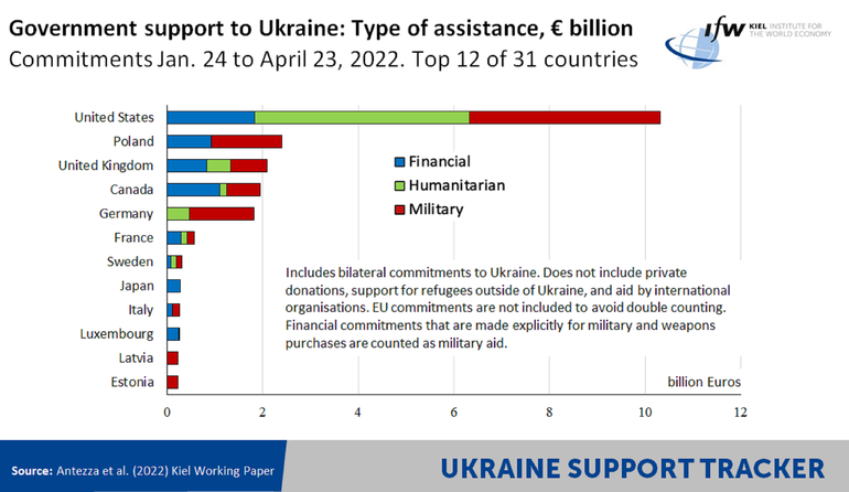 基爾世界經濟研究所(Kiel Institute for the World Economy)的估計,自俄羅斯入侵烏克蘭以來,美歐各國已向烏克蘭提供約1000億美元的軍事和經濟援助,其中包括精密複雜的軍事裝備,如愛國者防空系統,以及上週承諾的豹2式戰車(Leopard 2)和 M1艾布蘭戰車(M1 Abrams)。