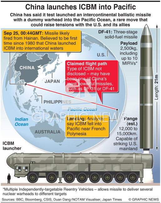 China test-fires intercontinental ballistic missile into Pacific Ocean.