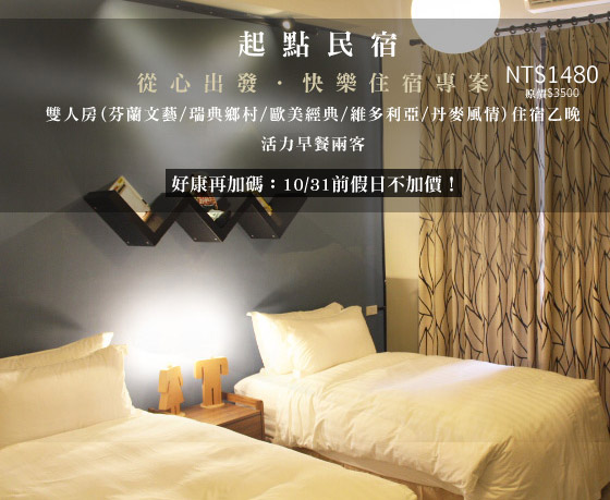 商品訊息簡述: 只要1480元(雙人價)即可享【起點民宿】原價3500元從心出發.快樂住宿專案:入住雙人房(芬蘭文藝/瑞典鄉村/歐美經典/維多利亞/丹麥風情)乙晚+活力早餐兩客。好康再加碼:10/31前假日不加價!