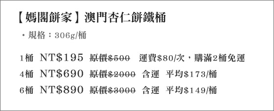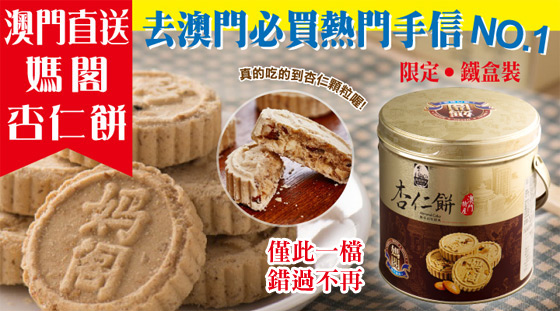 商品訊息簡述: 平均每桶最低只要149元起(2桶免運)即可購得【媽閣餅家】澳門杏仁餅鐵桶1桶/4桶/6桶(306g/桶)。