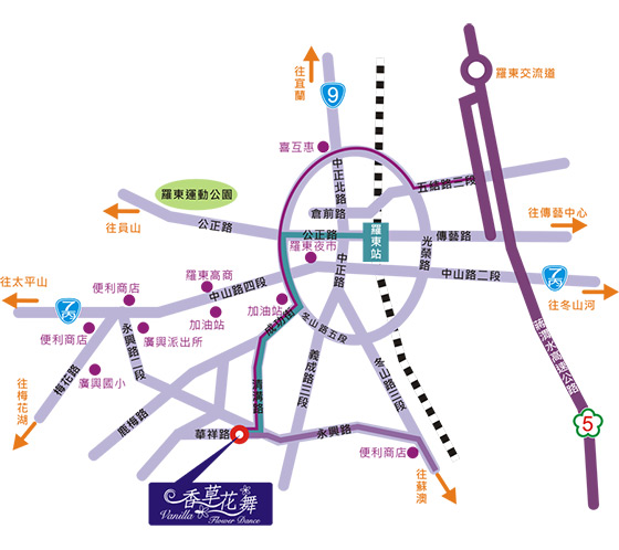 台北→國道五號→下羅東五結交流道→五結路三段右轉→光榮路→純精路→右轉成功街→接清溝路→永興路右轉→遇第二叉路左轉華祥路→香草花舞