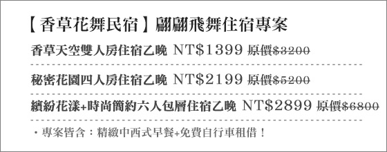shqrUhq?Z?商品訊息簡述: 只要1399元起即可享【香草花舞民宿】原價最高6800元翩翩飛舞住宿專案:(A)香草天空雙人房住宿乙晚/(B)秘密花園奶H房住宿乙晚/(C)繽紛花漾+時怏痊糷誘H包層住宿乙晚,專案皆含:早餐+Wi-Fi+停車空間。