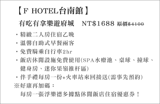 商品訊息簡述: 只要1688元(雙人價)即可享【F HOTEL台南館】原價4100元有吃有拿樂遊府城:精緻二人房住宿乙晚+溫馨自助式早餐兩客+免費騎乘自行車2hr+飯店休閒設施免費使用(SPA水療池、桌球、撞球、健身房、迷你果嶺推杆區)+伴手禮每房一份+火車站來回接送(需事先預約),好康在加碼:每房一張浮樂德多據點休閒飯店住宿優惠券!