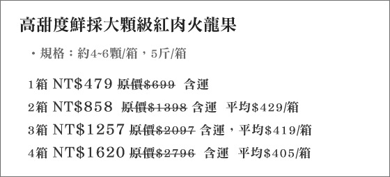 商品訊息簡述: 平均每箱最低只要405元起(含運)即可購得高甜度鮮採大顆級紅肉火龍果1箱/2箱/3箱/4箱(約4~6顆/箱)。